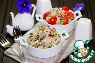 Поверх всей этой красоты укладываем морепродукты. В данном случае я использовала магазинный вариант, но вкуснее всего салат получается с морепродуктами, купленными на рыночном развале. Думаю, если самостоятельно обжарить морской коктейль на оливковом масле с розмарином и чесночком, будет неплохо тоже, но тогда времени на приготовление уйдет немного больше.