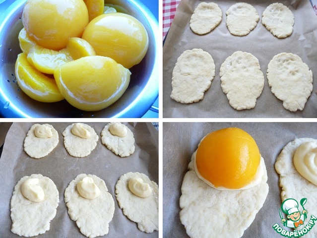 Предлагаю приготовить медальоны из творожного теста с растительным маслом. Тесто готовится очень быстро. Медальоны заполняются ванильным кремом и половинками персика (или абрикоса). Выпечка в меру сладкая. Рецепт встретился на немецком сайте у Sallys Welt.