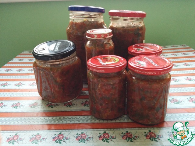 Томатная масса готовилась отдельно, затем соединила с перцами в большой кастрюле и продолжила процесс.