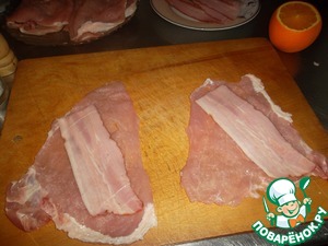Мясо хорошенько отбиваем. «Отбивнуху» не много присаливаем, слегка посыпаем перцем и выкладываем на нее полоску грудинки…