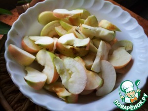 • Итак, для начала возьмем яблоки и нарежем тонкими кусочками. Желательно брать яблоки более кислыми, потому что шарлотка получается сама по себе сладкая, а с кисло-сладкими яблоками она будет замечательно гармонировать.