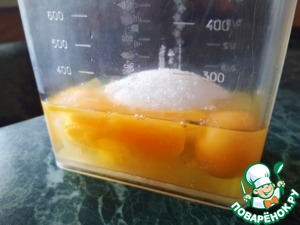 • Затем приступаем к тесту: яйца взбиваем с сахаром.