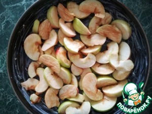 • Далее обильно смазываем форму маргарином или сливочным маслом, чтобы потом легко снять шарлотку. И выкладываем яблоки.