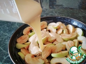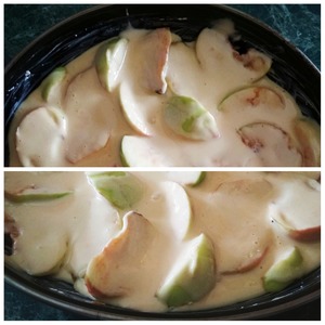 • Поверх яблок добавляем тесто. Оно не должно быть слишком густым и не слишком жидким.