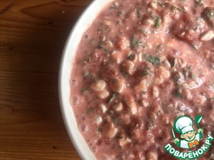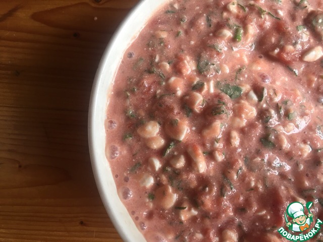 Смешать творог, зелень и томаты. С творога предварительно слить сливки. Я это сделать забыла, поэтому начинка получилась очень жидкой, больше похожей на соус.