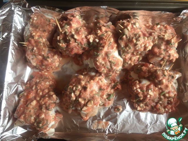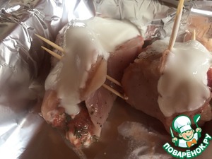 Выложить начинку на отбитые грудки, сформировать рулетики, закрепить зубочистками или шпажками. На каждый рулетик выложить по 1-2 ложки сметаны.