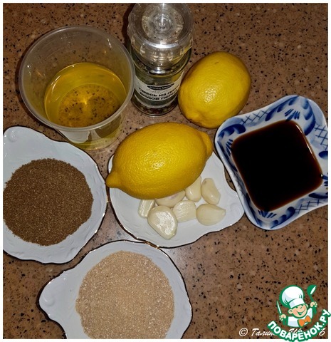 Готовим пару лимонов, чеснок, перец - лучше в мельнице, масло растительное (мы взяли из виноградных косточек), кориандр молотый (скорее - дроблённый), сахар (если есть тростниковый такой, коричневый, лучше взять его, соус соевый, и пара некрупных луковиц еще понадобится. -