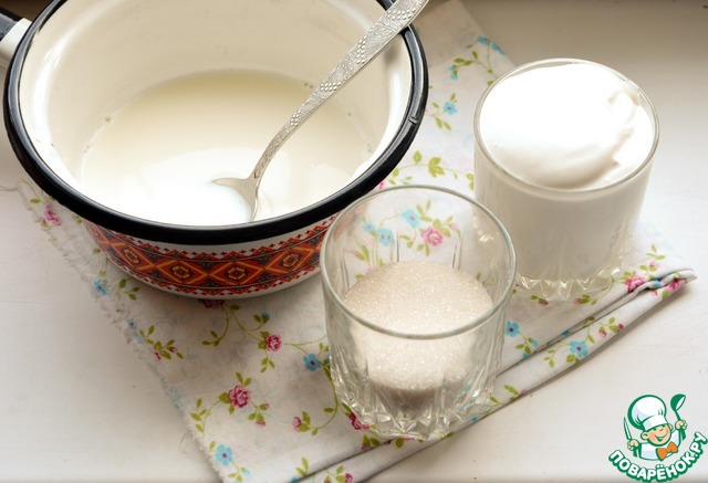 Затем подогрейте молоко с желатином до полного его растворения, добавьте сахар, ванильный сахар и сметану, хорошо размешайте всё до однородности