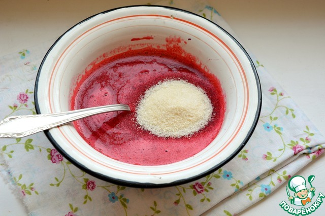 Измельчите ягоды блендером, а затем протрите через сито, чтобы не попали косточки. В полученное пюре добавьте желатин, размешайте и оставьте для набухания на 20 минут