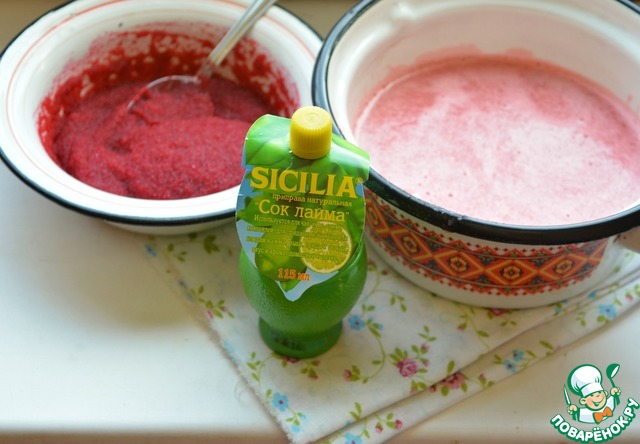 Добавьте к арбузному пюре ягодное пюре с желатином, сахар, соль и сок лайма SICILIA, нагрейте слегка до полного растворения желатина. Слегка остудите массу