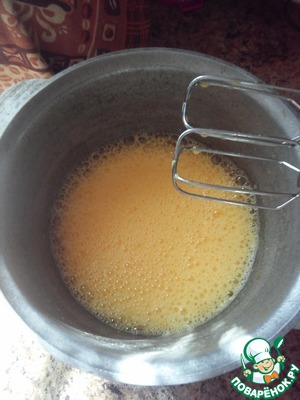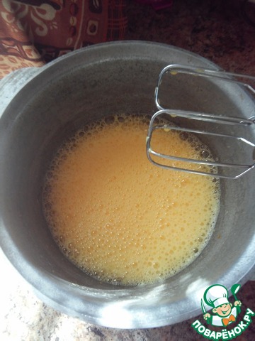 Яйца взбить в устойчивую пену, затем добавить сахар и взбивать не менее 10 мин.