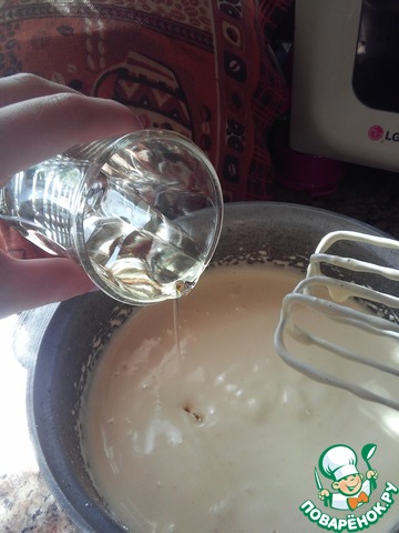 Затем влить 2 ст. л. кипятка, еще взбить. Добавить масло растительное и снова взбить, примерно 2 мин.