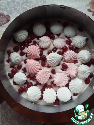 Выложить первый корж в кольцо, пропитать. Вы можете сделать любую пропитку по вкусу. Я соединила сгущенное молоко с ликером "Бейлис", развела его теплой водой. Смазать корж кремом, выложить вишню и безе.