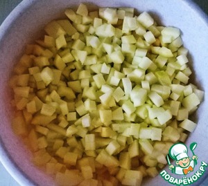 Подготовим яблоки. 2 средних или больших яблока помыть, очистить от кожуры и порезать на мелкие кубики. Советую брать яблоки кисло-сладкие и твердые, тогда в готовой выпечке они будут лучше чувствоваться и не превратятся в кашу