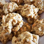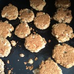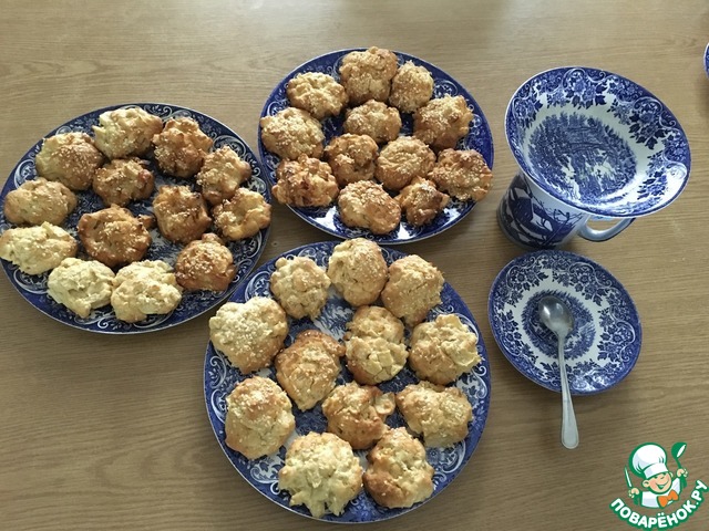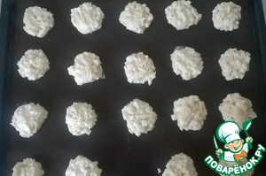Мокрыми руками формируем печенюшки (примерно полстоловой ложки теста) и выкладываем их на противень, застеленный антипригарным ковриком (смазывать его не нужно) или пергаментной бумагой, смазанной растительным маслом. Выпекаем до готовности примерно минут 15, пока печенье не зарумянится сверху.