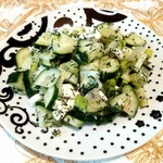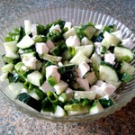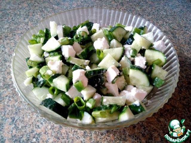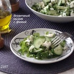 Смешать огурцы, зелень, сыр. Если надо, то досолить. Заправить оливковым маслом. Перемешать.