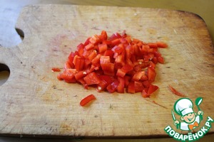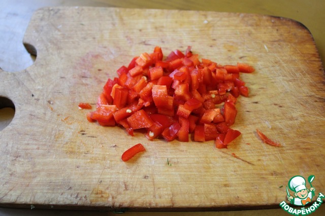Вымыть, обсушить, удалить семена и нарезать мелкими кубиками болгарский перец.