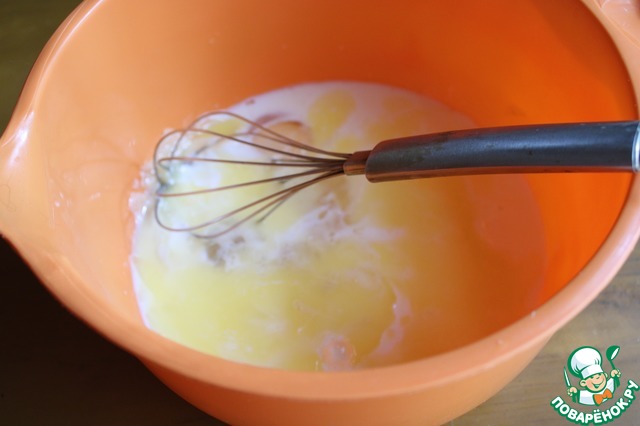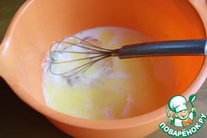Соединить в однородную смесь соль, сахар, яйца, молоко и растопленное масло.