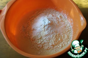 Всыпать просеянную муку двух видов с разрыхлителем. Перемешать.