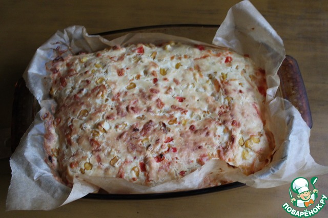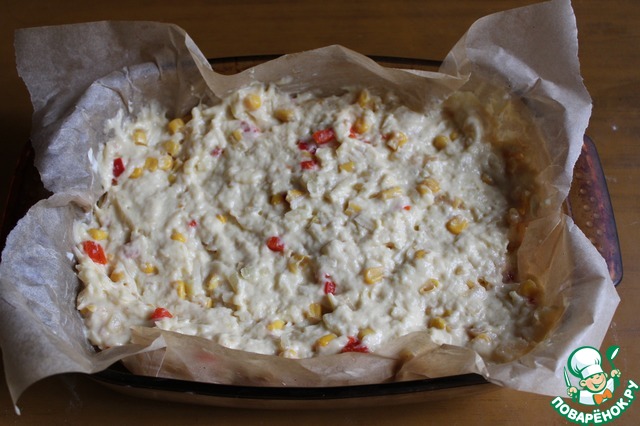 Форму проложить бумагой для выпечки, смазать маслом. Выложить тесто. Разровнять. Поставить в разогретую духовку. -