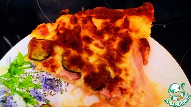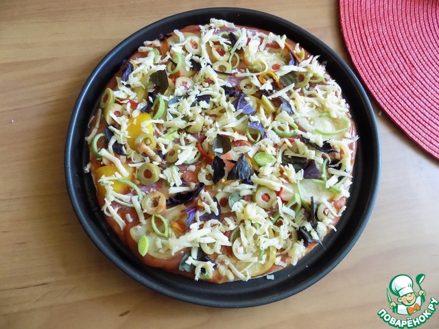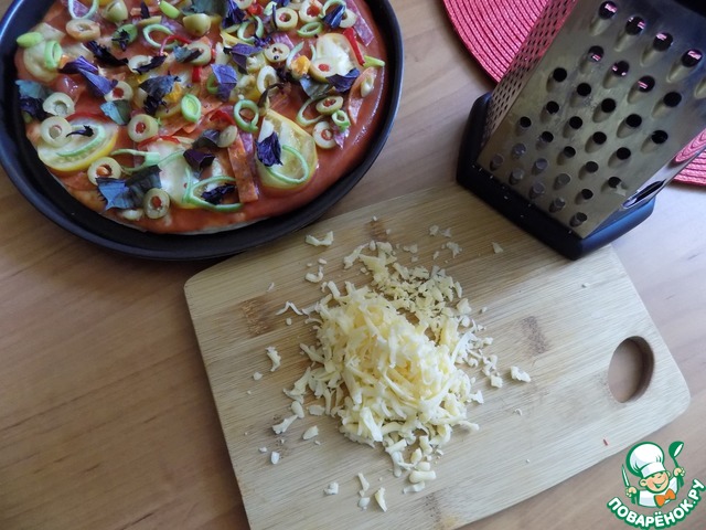 Присыпаем верх сыром и ставим выпекаться. Пиццу в домашних условиях лучше выпекать в духовке при максимальной температуре. У меня электрический духовой шкафчик и максимальная температура 250 С. Выпекала 15 минут.