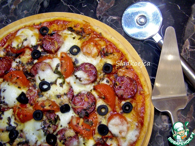 В этом рецепте больше хочу сказать о начинке пиццы. Тесто делаю давно и почти всегда бездрожжевое. Его можно посмотреть вот здесь: https://www.povareno k.ru/recipes/show/15 1074/ Всем известно, что первым слоем на тесте должен быть томатный соус. Соус острый можно сделать самим, а можно для быстроты использовать соус "Краснодарский", добавив в него чеснок и молотый жгучий перец - просто отлично. Для пиццы купила итальянскую салями и пепперони. Замечательная колбаска для пиццы... Приступаем!