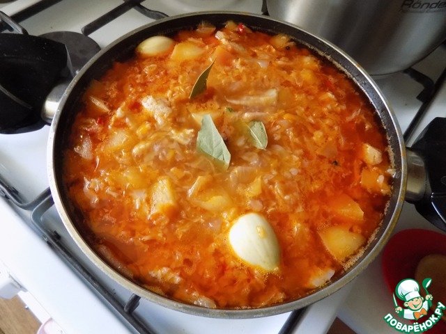 Варим щи ещё минут 10. Пробуем на соль и по желанию досаливаем. Чеснок можно удалить. -