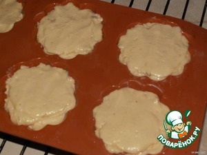 Форму для кексов смазать растительным маслом, выложить в них тесто. Тесто получится густоватым, поэтому сверху тесто разгладить мокрыми руками.