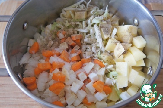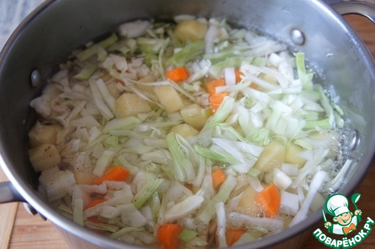 Точно так же нарезать 2 сырые картофелины, луковицу и морковь, мелко нашинковать 300 г капусты.