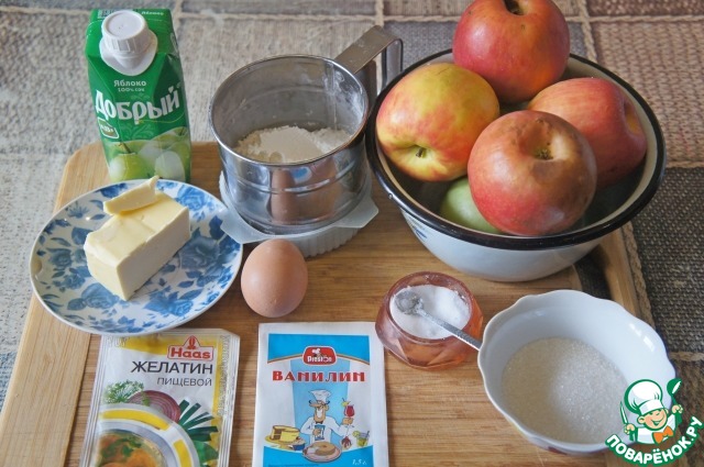 Мне желе показалось мало, оно все впиталось в яблоки. Поэтому я сделала еще одну порцию желе и вылила на остывший пирог, когда оно начало густеть. Вот и получился такой желированный слой сверху.
