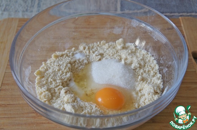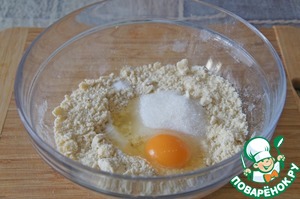 Муку просеять холмиком, сделать углубление, положить в него сахар, яйцо и масло.