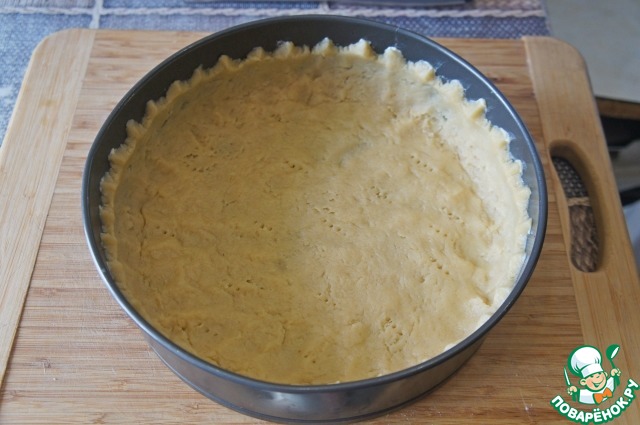 Затем раскатать в пласт, выложить в смазанную маслом форму d 23-24 см, закрыв края.