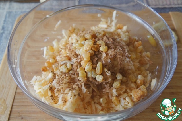 Яблоки натереть на крупной терке, добавить сахар и изюм. Можно по вкусу добавить корицы. Яблоки можно использовать сырые или немного притушить их. Я делала с сырыми яблоками.