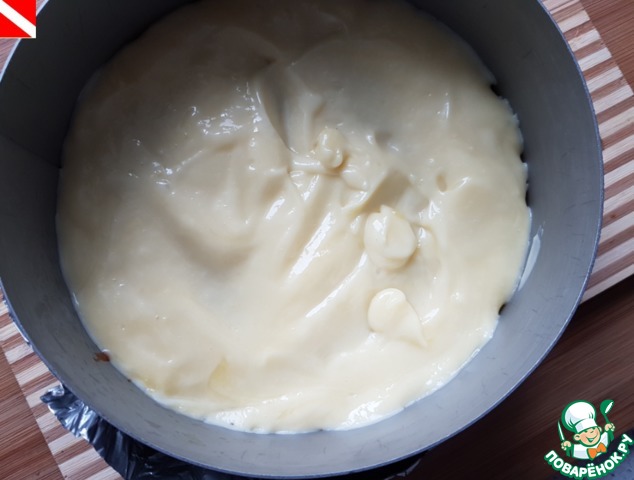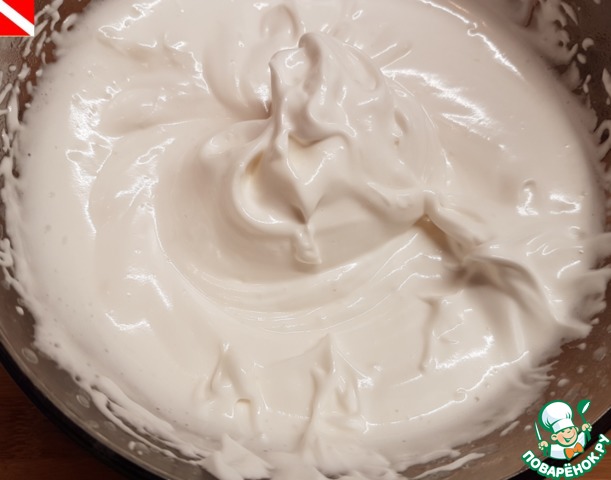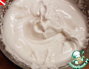 Далее все происходить очень быстро: закипевший сироп вливаем тонкой струйкой в белки, не переставая взбивать. Масса становится пышной и воздушной. Затем добавляем масло со сгущенкой и перемешиваем на минимальных оборотах миксера до объединения.