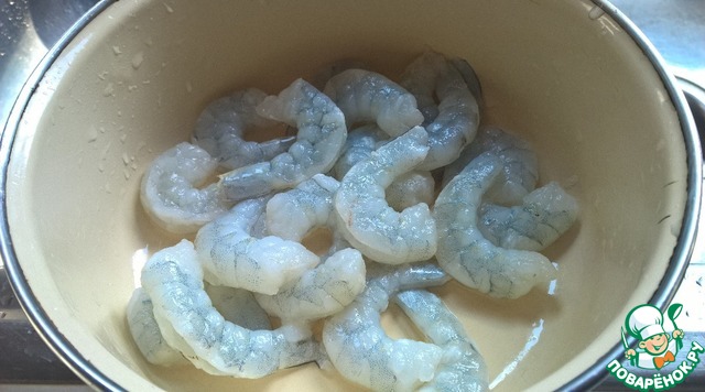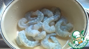 Берем сырые креветки, если они с панцирем или с хвостиками - чистим. Если креветки замороженные, предварительно ставим в холодную воду минут на 20. Если у креветок не удален кишечник (черная жилка по спинке) - надрезаем спинку острым ножом и вытягиваем кишечник.