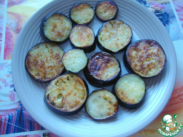 Баклажаны нарезать кружочками, обжарить в растительном масле. Выложить в один слой на тарелку.