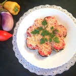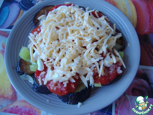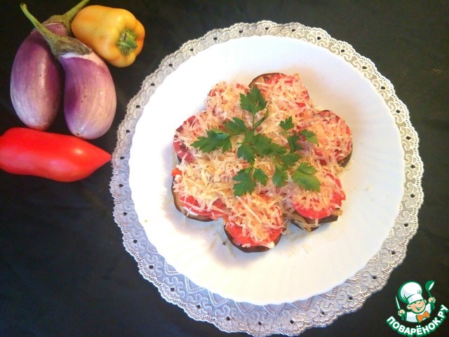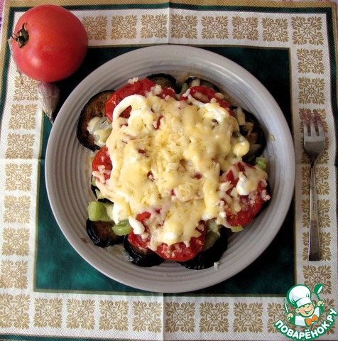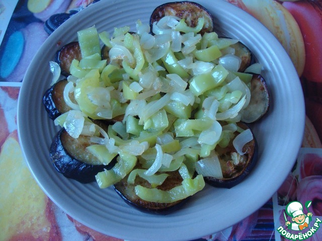 • Баклажаны нарезать кружочками, обжарить в растительном масле. Выложить в один слой на тарелку.
