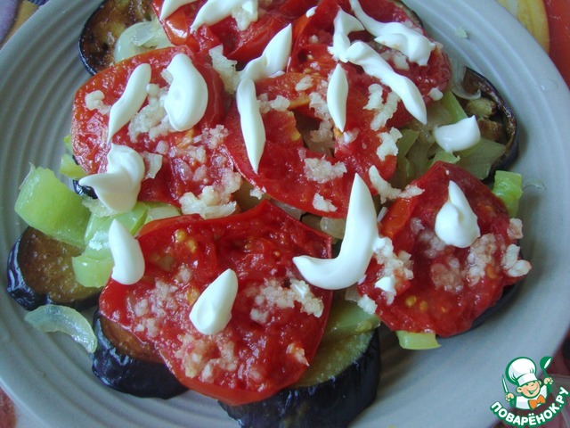 • Затем томаты, нарезаем кружочками и обжариваем. Аккуратно переносим их на тарелку третьим слоем, выдавливаем на них чеснок и смазываем по желанию майонезом.