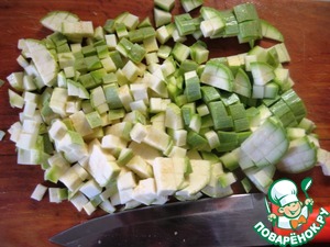 Добавить нарезанные кубиками кабачки. Обжарить всё вместе.