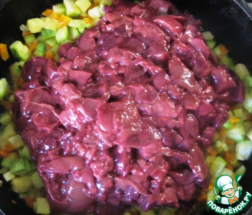 Затем добавить к овощам нарезанную небольшими кусочками куриную печень и обжаривать всё вместе до готовности печени. Приправить солью и черным перцем по вкусу.