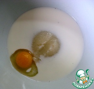 Для теста: в миске соединить теплое молоко, яйцо, добавить щепотку соли, сахар. Хорошо перемешать.