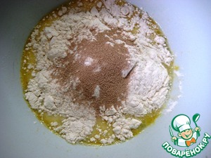 Добавить половину необходимого количества муки и дрожжи.