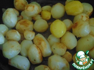 Разогреть духовку до 190 градусов, начистить картошку и, пока разогревается духовка, обжарить картофель до золотистого цвета.