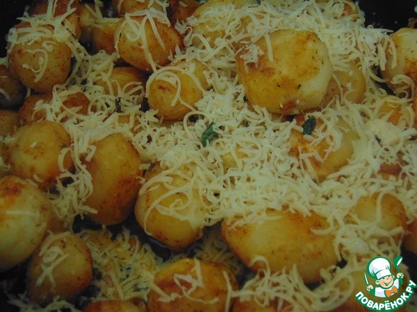 Выключить плиту. Посыпать тертым сыром и поставить в духовку запекаться на 15 минут.