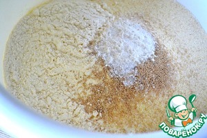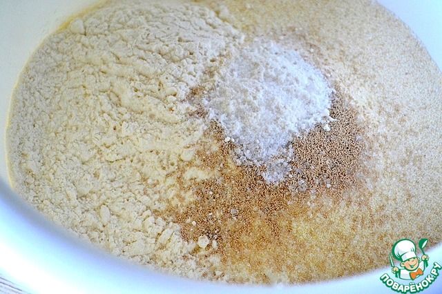 Итак, надо смешать все сухие составляющие - муку, манку, сахар, соль, дрожи и разрыхлитель -