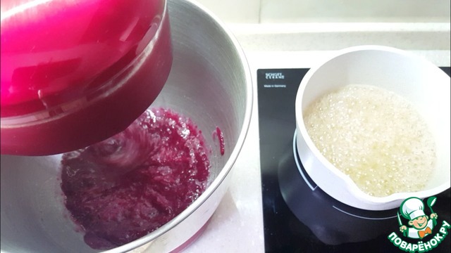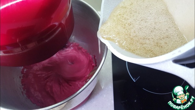 Когда сироп достиг 110 градусов, тонкой струйкой по стенке вливаем в пюре. Скорость миксера немного убивляем, чтобы сироп не разбрызгался по стенкам.