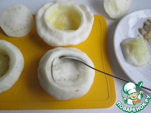 Затем срезать крышечки и аккуратно вынуть мякоть. В этих патиссонах частично семечки сформировались, поэтому их надо отделить и оставшуюся мякоть измельчить.
