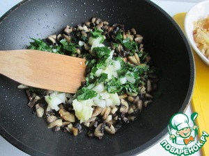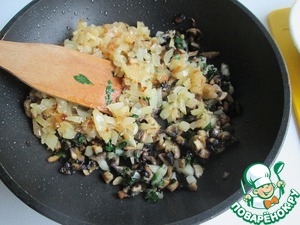 Затем грибы обжарить до корочки на растительном масле, добавить к ним измельчённую мякоть патиссонов и нарезанную зелень петрушки. Всё перемешать и жарить 3-5 минут.