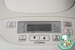 Выбираем режим "Основной", размер хлеба - М (в моей ХП это на 400 г. муки), цвет корочки - по желанию. Нажимаем кнопку "Старт".