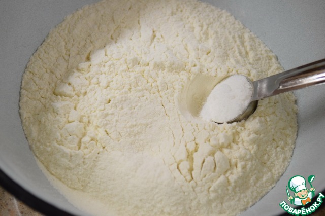 Муку просеять и смешать с разрыхлителем.